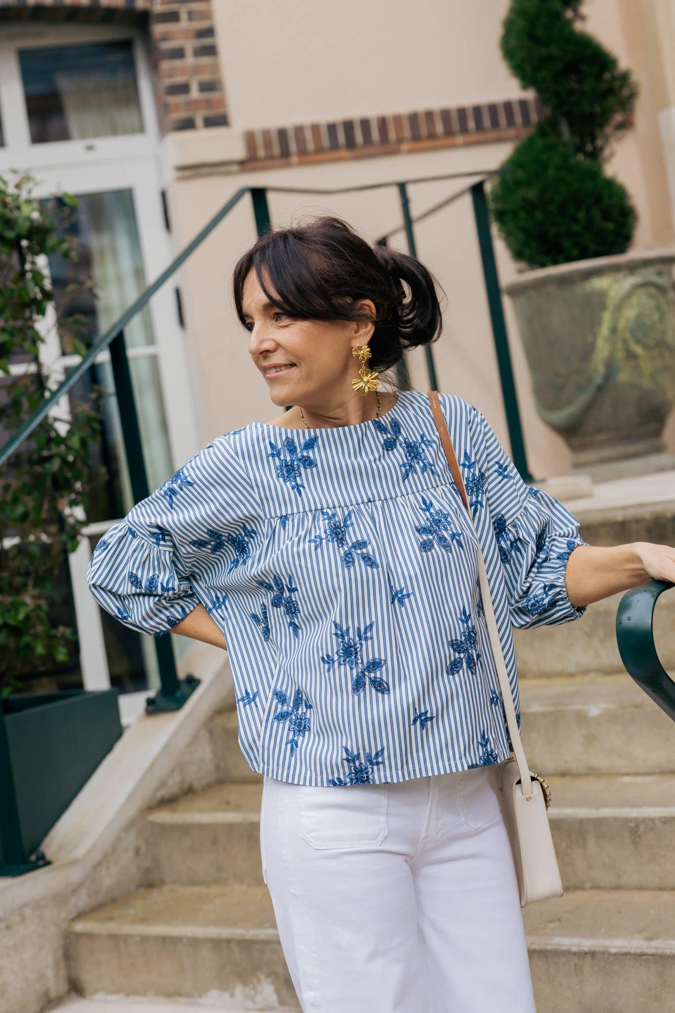 - Motif : Fleurs brodées sur fond de rayures.