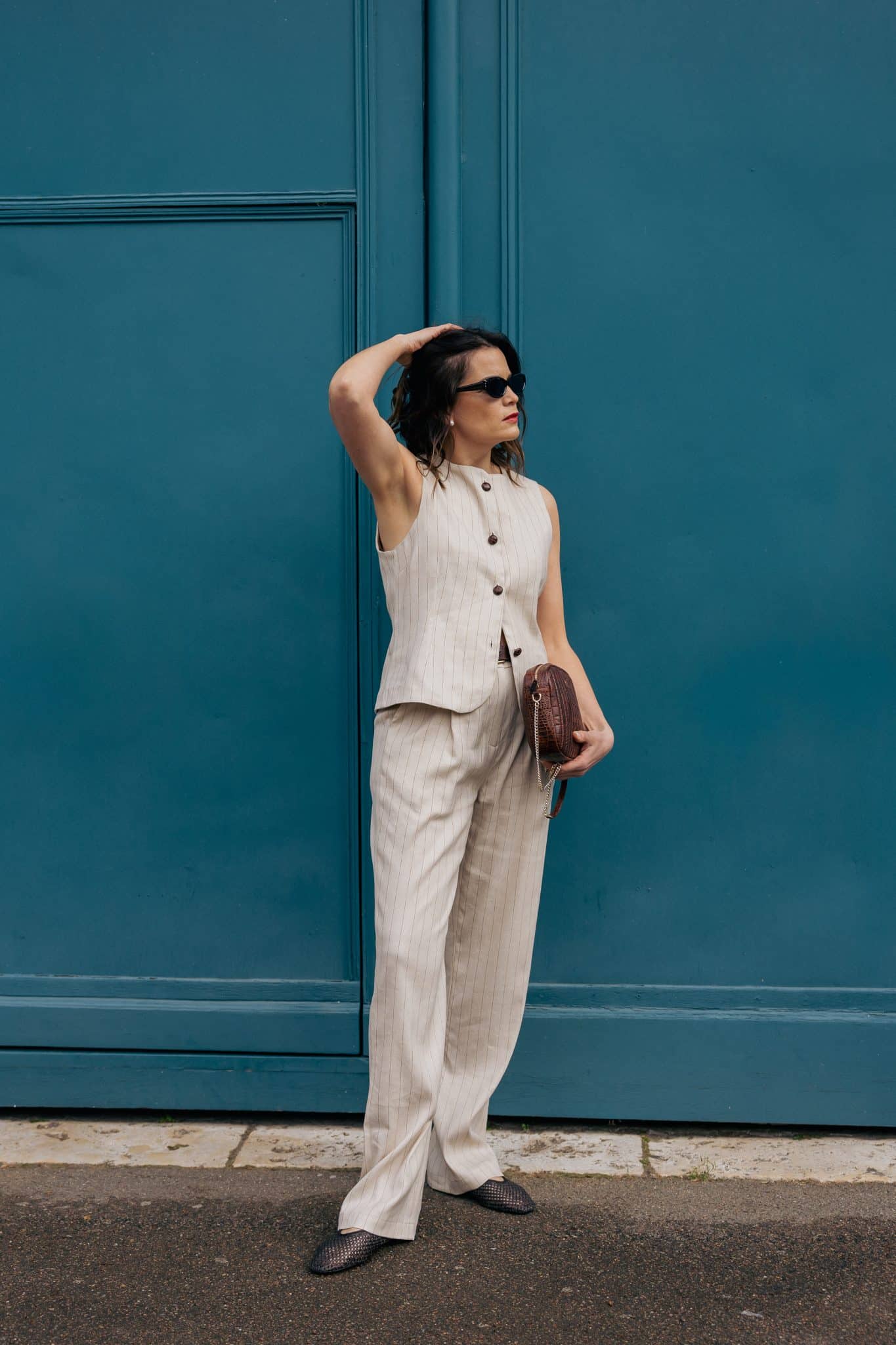 Sa composition associant polyester, lin, viscose et touche d’élasthanne lui confère une tenue parfaite, tout en conservant souplesse et confort. Le lin apporte un léger grain naturel, tandis que la viscose adoucit la matière. Fabrication : Italie.