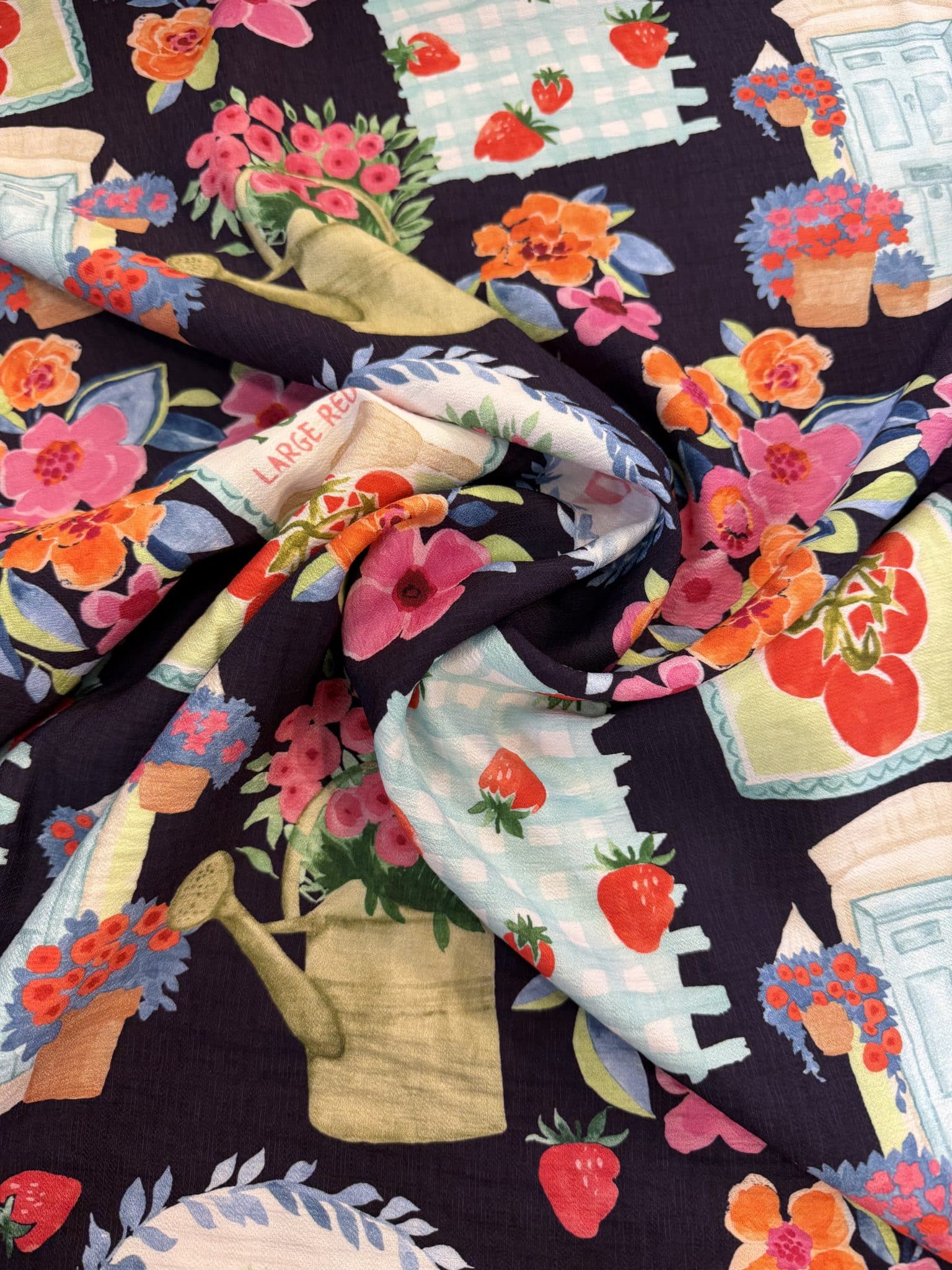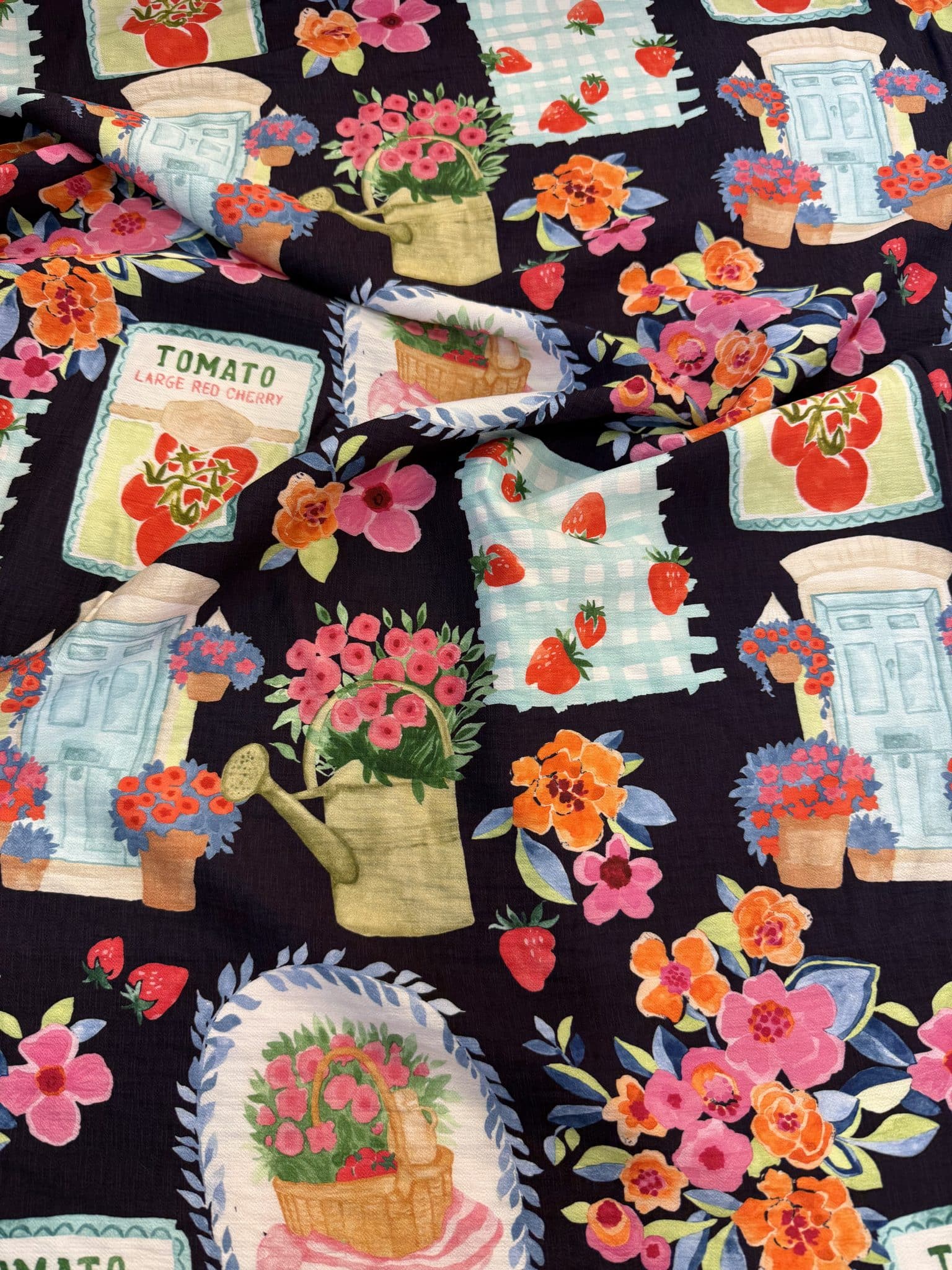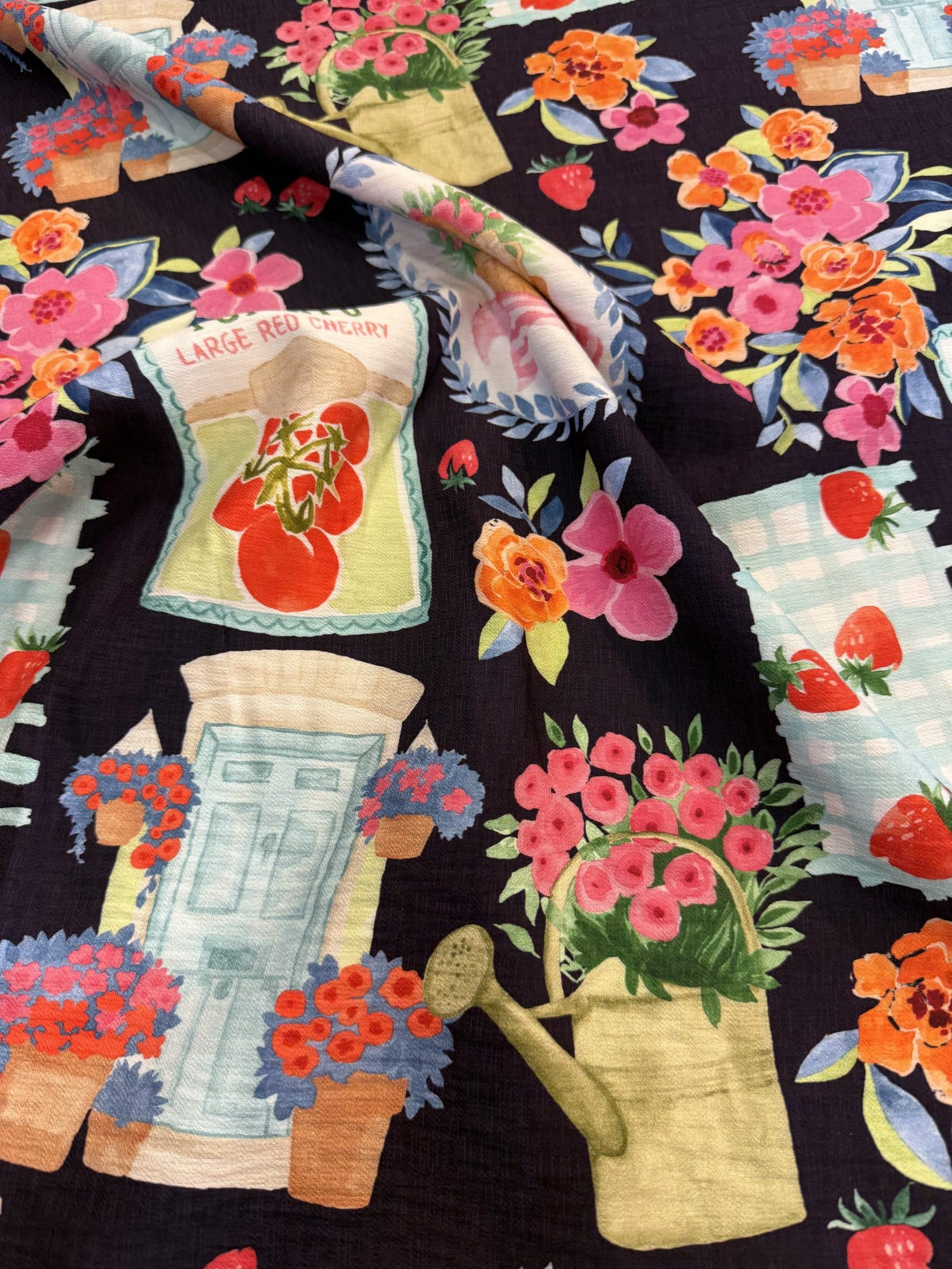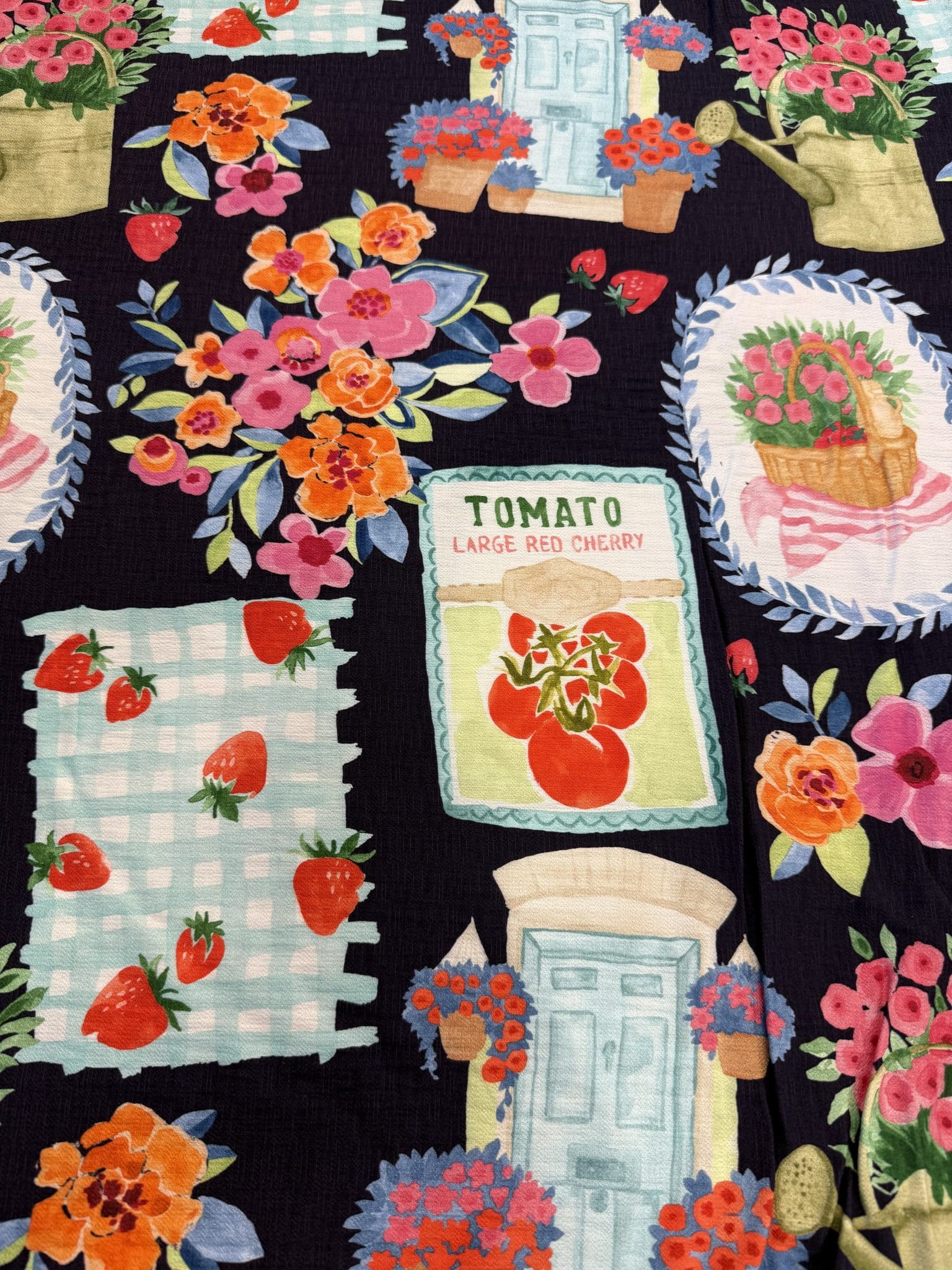 MATERA : Avec son imprimé fond marine profond sublimé par des touches éclatantes de rose, corail, bleu et vert tendre, Matera attire immédiatement le regard. Son univers évoque un jardin foisonnant, entre fleurs en pleine éclosion, petites fraises, arrosoir poétique et détails illustrés au charme rétro.
