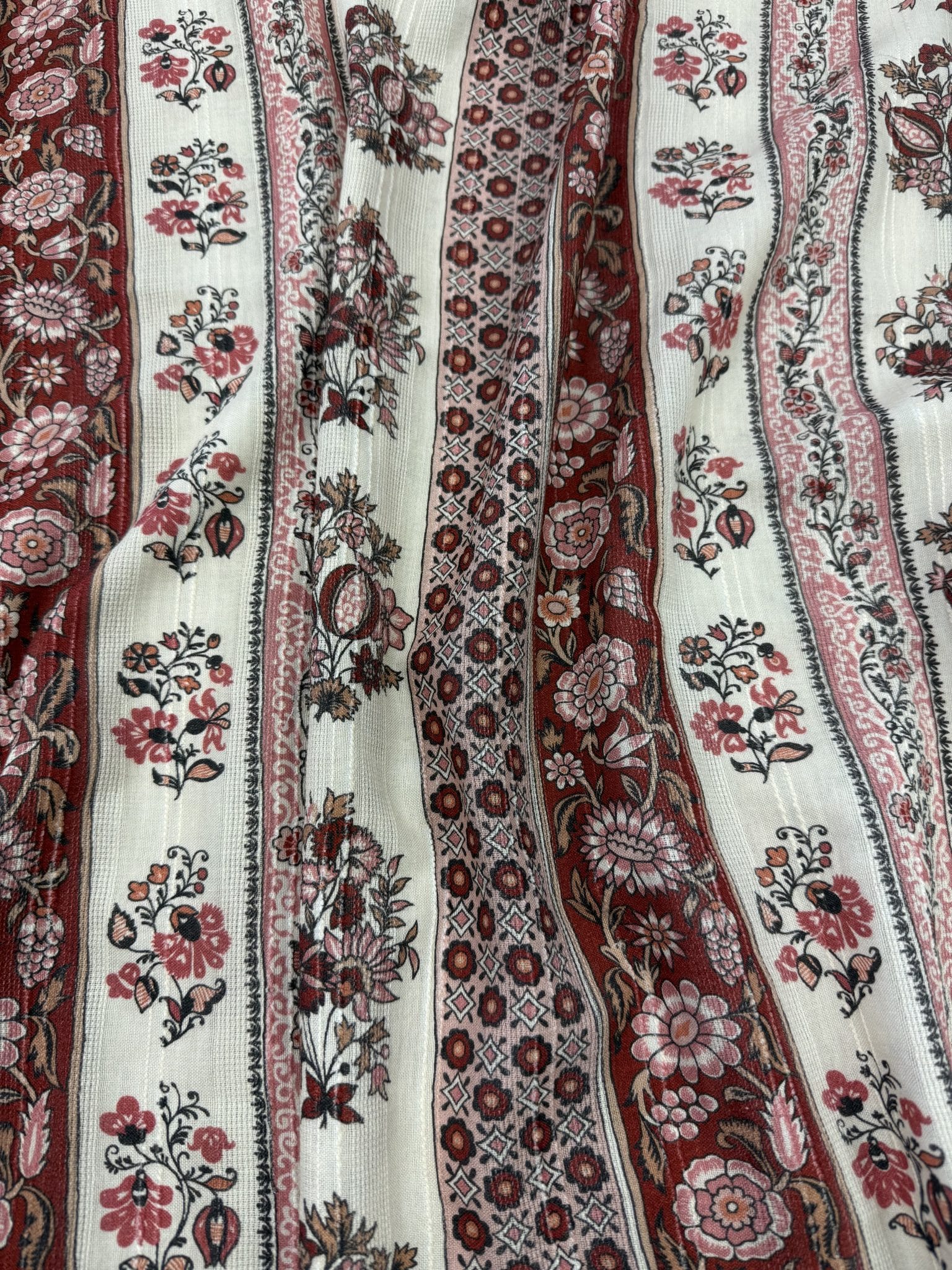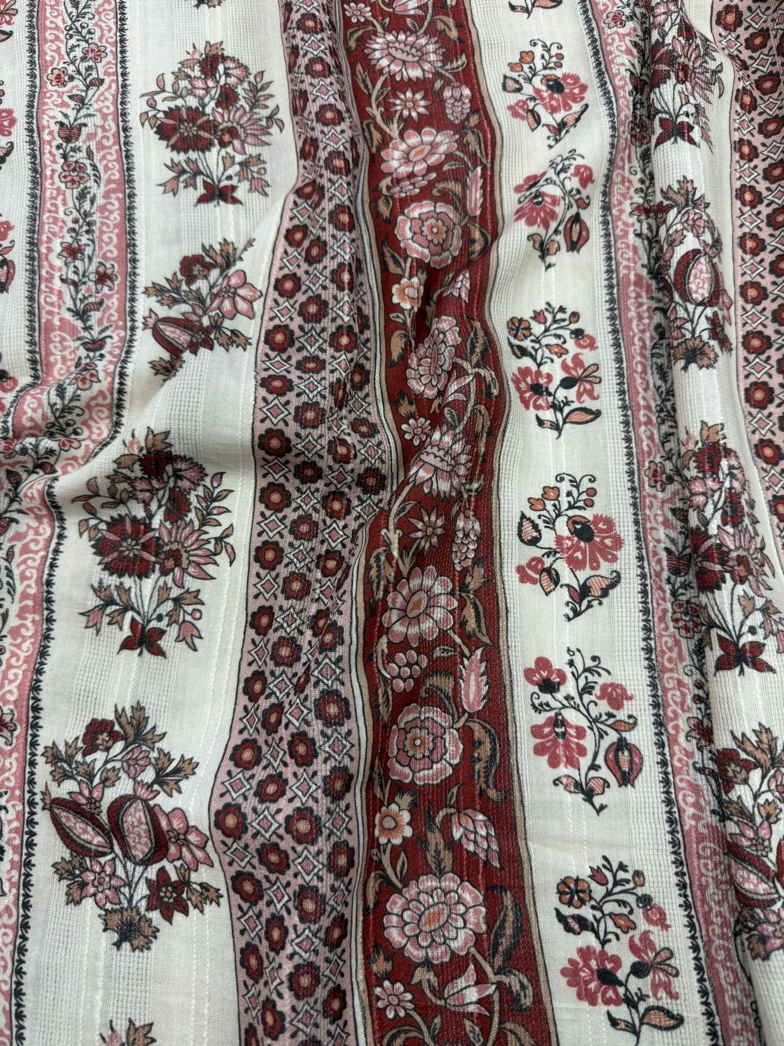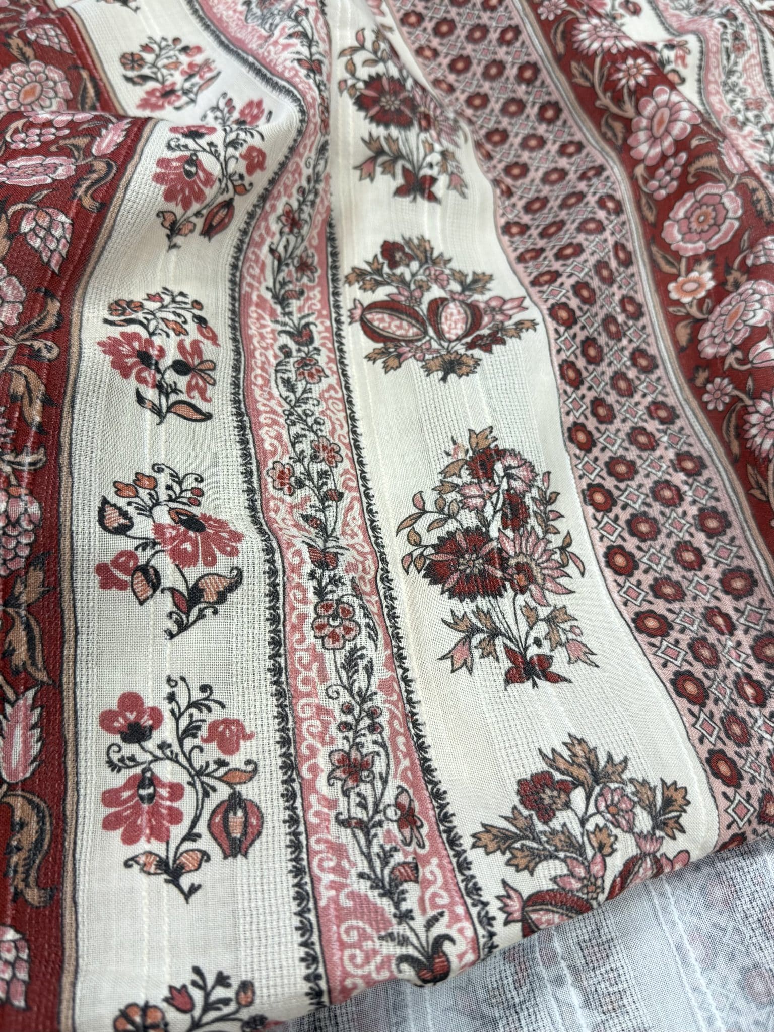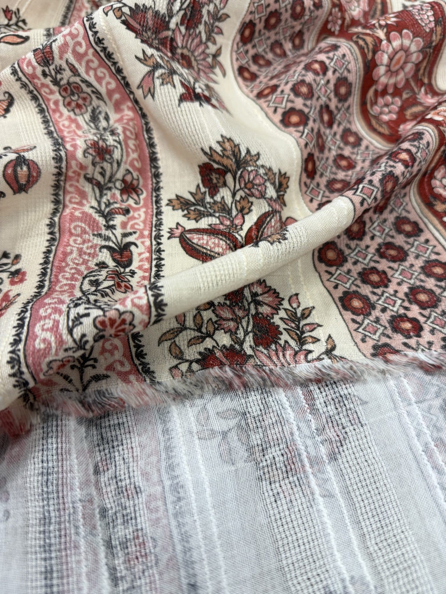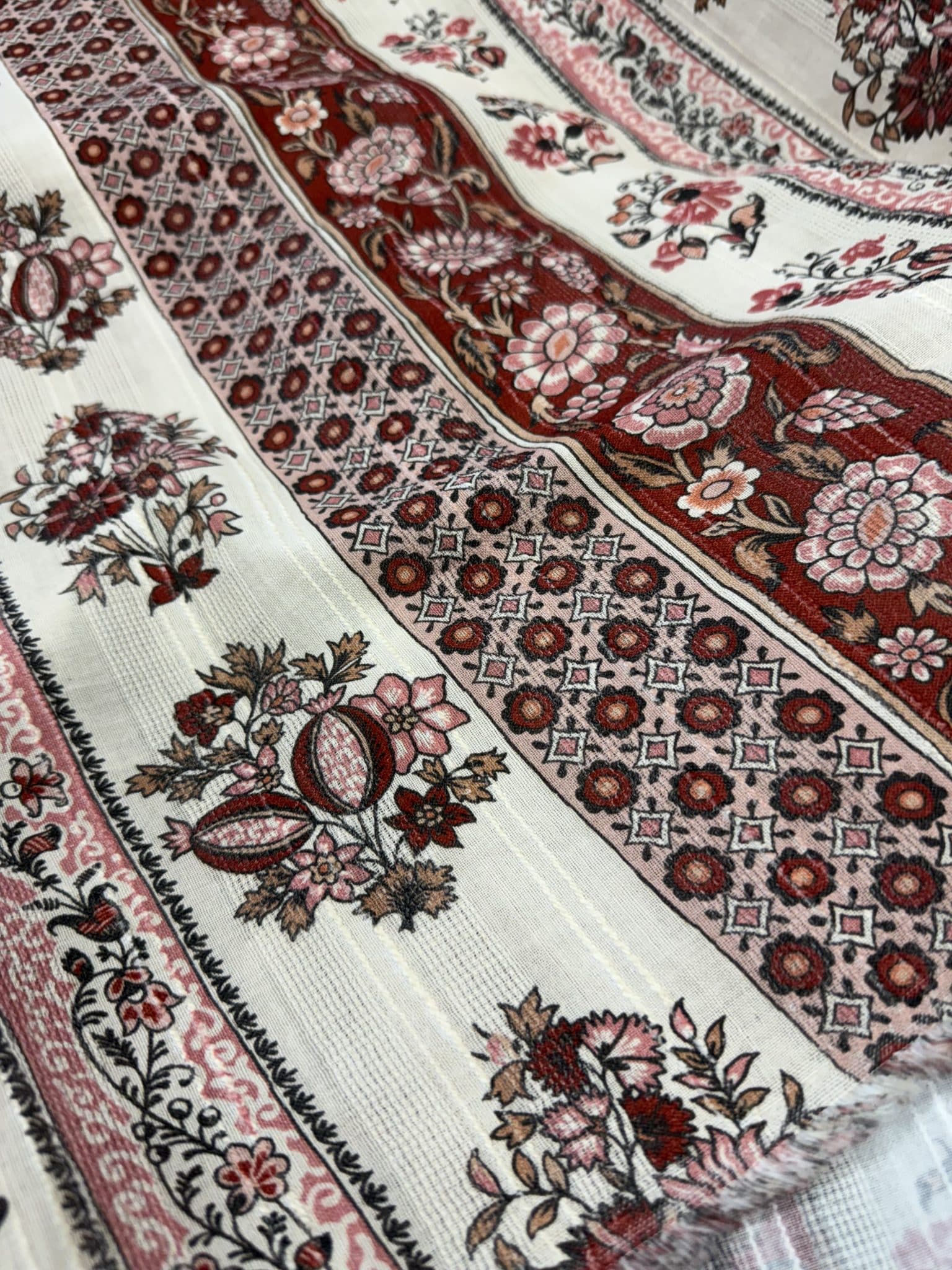 Léger, respirant et agréable à porter, il se distingue par son esprit bohème et son motif à rayure mêlant fleurs et ornements d’inspiration provençale, qui créent un imprimé riche et vivant, plein de caractère. Les tons terracotta, rose poudré et écru s’entrelacent dans une harmonie douce et chaleureuse. Le tissage en fines rayures texturées apporte du relief à l’imprimé et confère au tissu un tombé fluide, inspirant, pensé pour imaginer des robes fluides, blouses bohèmes ou jupes estivales.