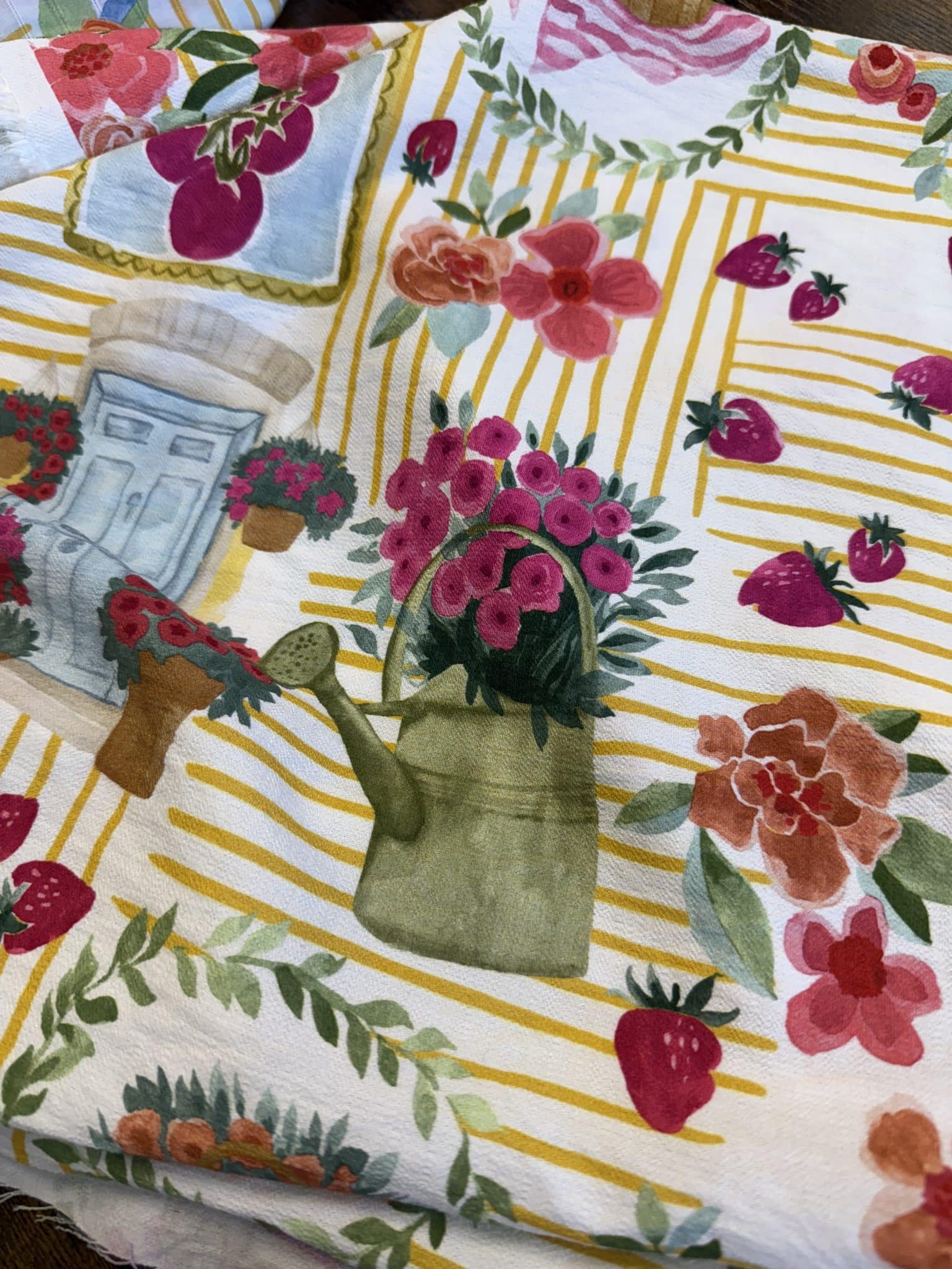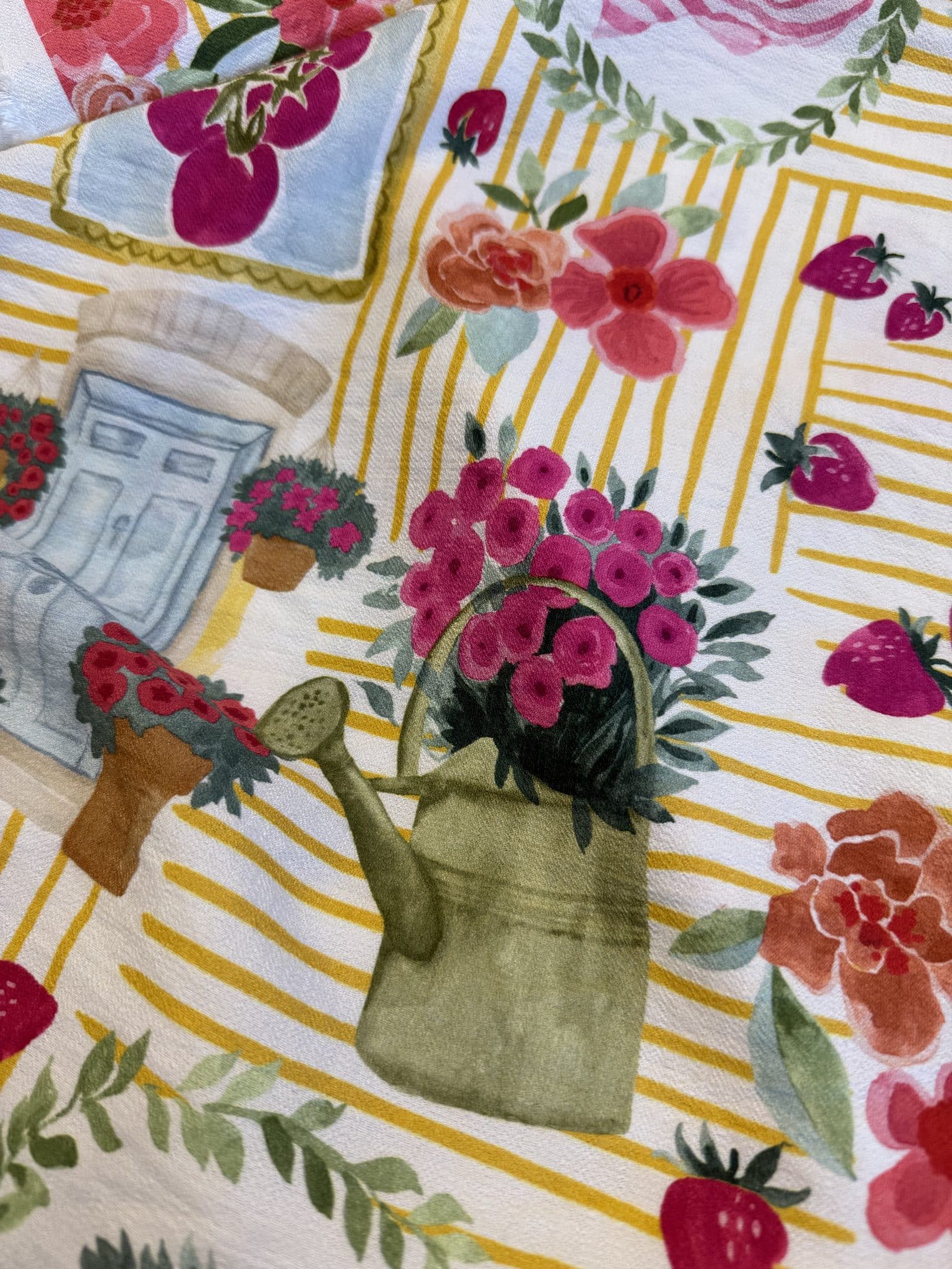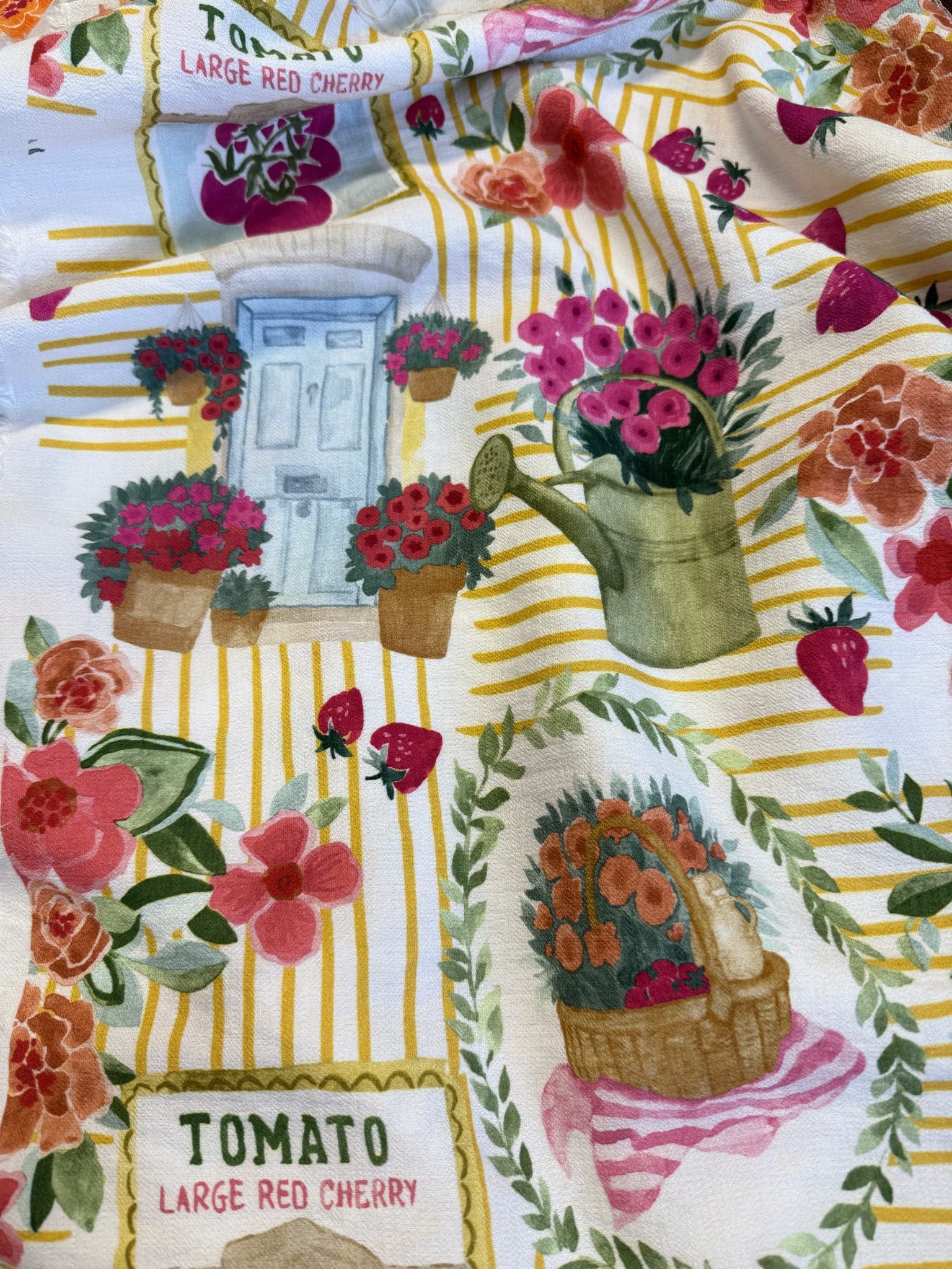 SOLE MIO : Un imprimé de fraîcheur qui évoque un jardin d’été baigné de lumière. Sole Mio séduit par son esprit pachtwork délicat, mêlant fleurs éclatantes, petites fraises, rayures fines et illustrations au charme rétro. Ce crêpe de viscose offre un très joli tombé élégant, avec assez de tenue pour mettre en valeur l’imprimé tout en conservant la douceur et la fluidité que l’on aime tant pour la belle saison.